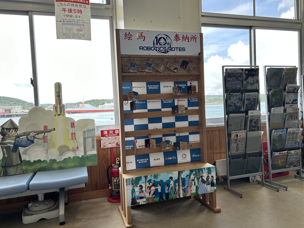建物内には種子島観光協会があり、ロボノのパネル、グッズ、10周年記念絵馬などが展示されています。